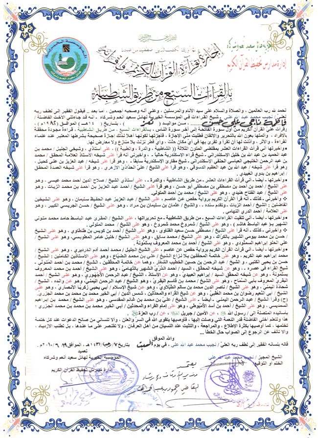 ·        إجازة بالقراءات السبع من طريق الشاطبـيـــــــة