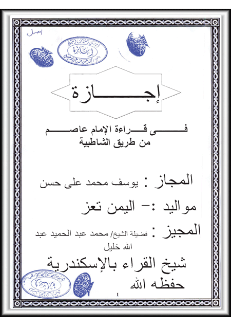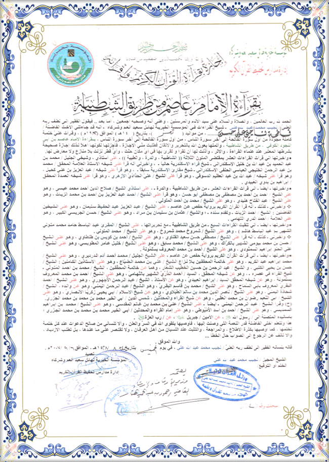 ·        إجازة  بقراءة الإمام عاصم من طريق الشاطبـيـــــة