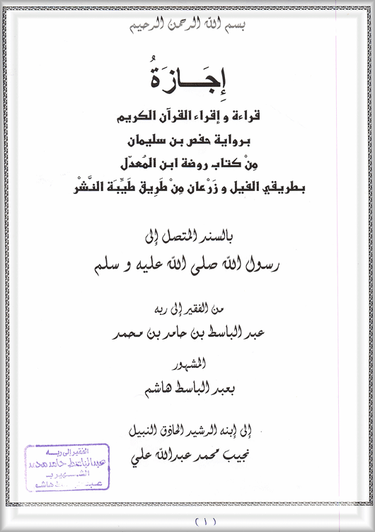 ·        إجازة بقراءة الإمام عاصم الكوفي