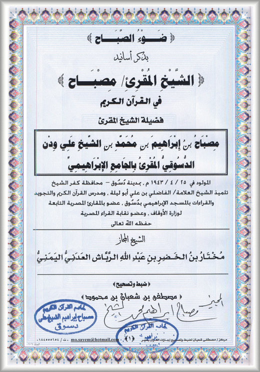 ·        إجازة في قراءة الإماميـــن نافع وعاصم