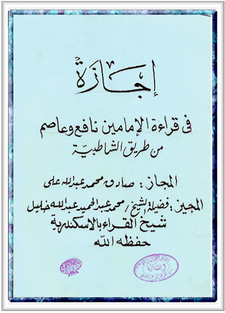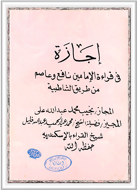 - كما قرأ على يد الشيخ / محمد عبد الحميد الإسكندراني  - شيخ قراء الإسكندرية - قراءة الإمام عاصم و أجازهُ بها عا   2009